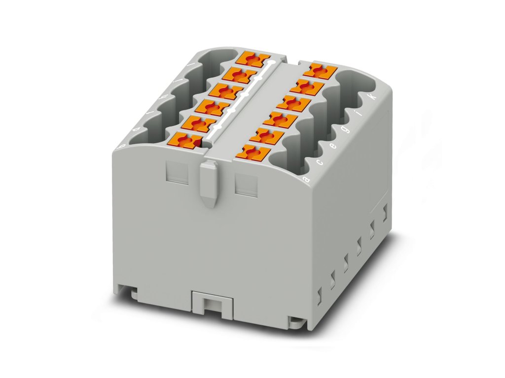 Blok rozvodek, Svornicová základna, jmenovité napětí: 450 V, jmenovitý proud: 24 A, počet přípojek: 12, typ připojení: Svorky Push-in, průřez: 0,14 mm2 - 4 mm2, způsob montáže: osaditelné na adaptér na nosnou lištu, Přímá montáž s přírubou, Plovoucí, barva: šedáDoplňkové parametry